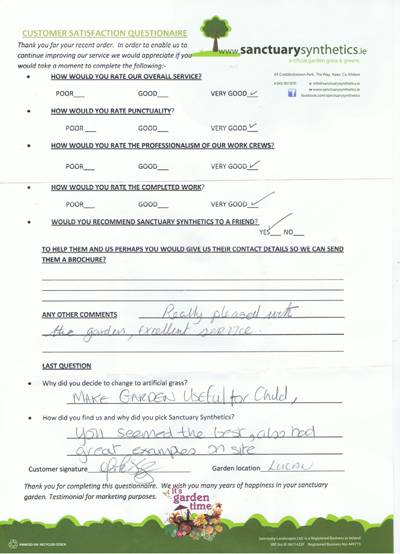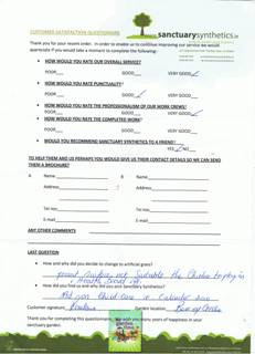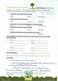“Hi Mark!! I’m absolutely DELIGHTED with it! Can’t stop looking out the window! The three guys you had working at my home were excellent … very hard working and very professional! I would definitely recommend sanctuary synthetics to family and friends!”